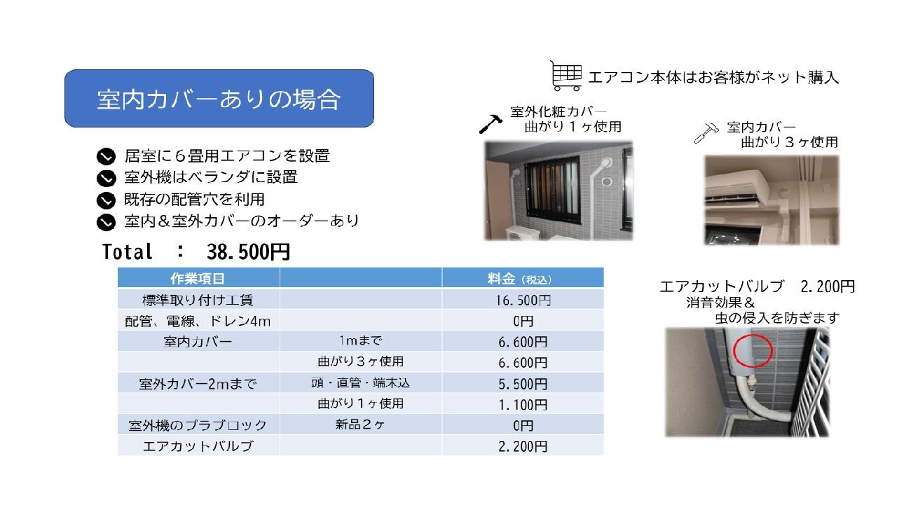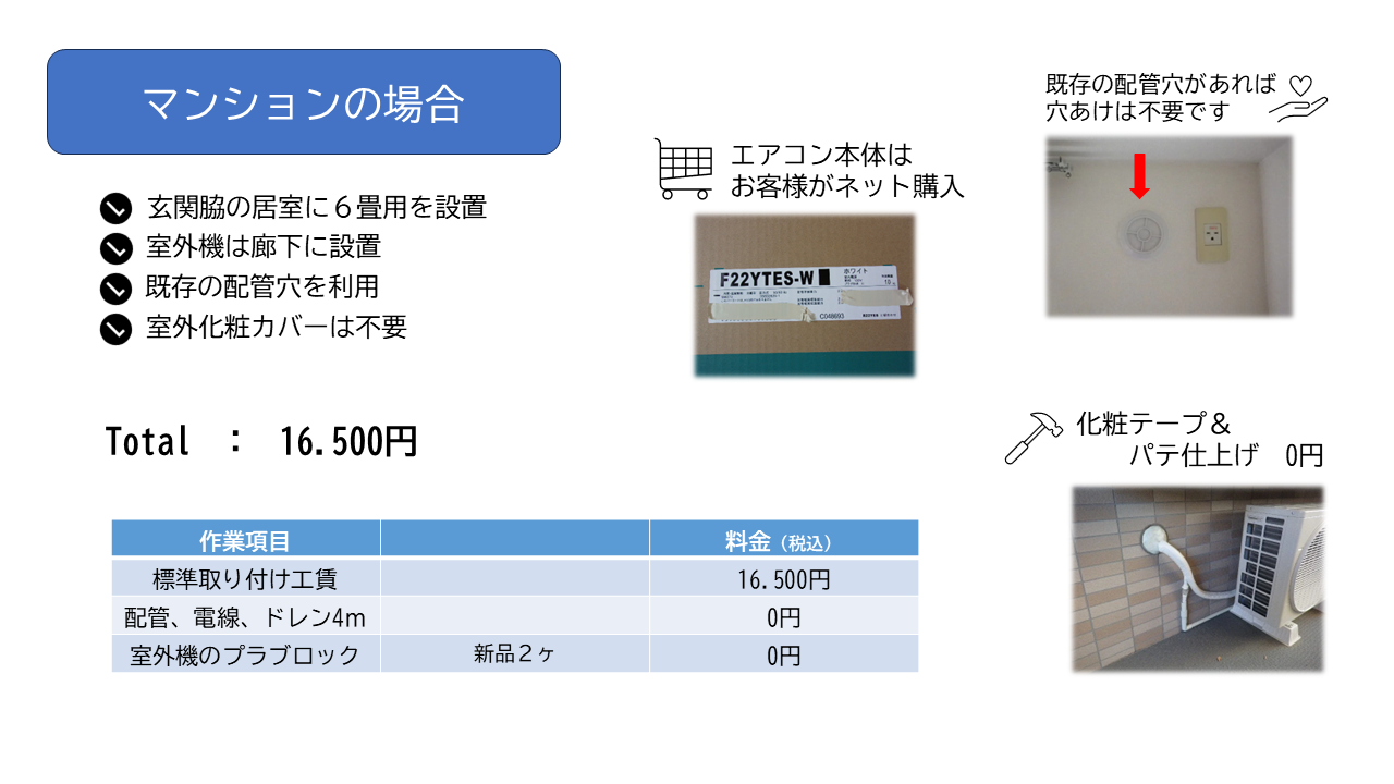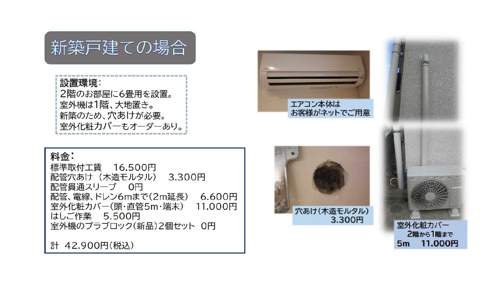 配管貫通スリーブ・室内機コンセントアース工事・配管穴パテ2個を含んだ税込価格です。これらは安全な工事には必要不可欠なのでオプションにはしません。